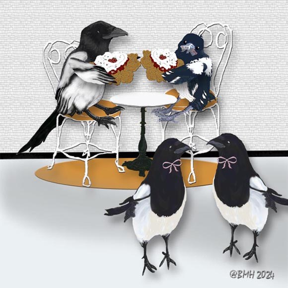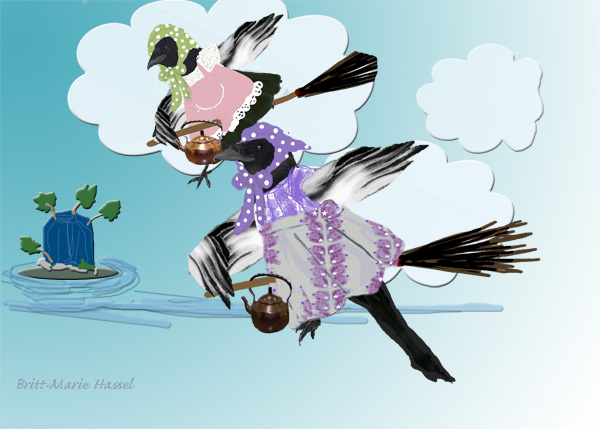 Skator har alltid fascinerat mig tycker nog att de har fått ett oförtjänt rykte som inte riktigt stämmer jag tycker de är intelligenta och smarta dessutom finns det en oerhörd drivkraft i deras byggande av bon, riv ner det så är det tillbaka i samma skick inom några veckor envisa som den. En god vän sa en gång för länge sen att träffar du på en skata på väg till jobbet tex. då ska du hälsa på den, god dag skata ha en bra dag skata. Gör du det så får du bra tur hela dagen. Just nu är skatorna en stor del i mitt skapande och jag kommer hela tiden på nya äventyr för skatorna som gärna härmar oss människor i det som vi tycker är kul. Familjen består av: Pappa Skata - Hugo - Mamma Skata - Hilma - Storebror Sven - Storasyster Ellen - Småsyrrorna tvillingarna Sara och Klara, nykläckte lillebror Sixten och så mammas kusin Ove.